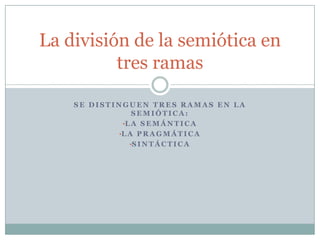 La semiótica estudia los signos y cómo se produce el significado en varios sistemas culturales. Se divide en tres ramas: la semántica estudia las relaciones entre signos; la pragmática analiza el significado del hablante y el contexto; y la sintáctica estudia las relaciones entre símbolos.