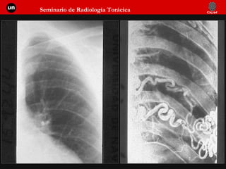 Este documento proporciona una guía sistemática para la lectura de radiografías torácicas, describiendo la apariencia normal del corazón y los vasos así como varias patologías. Se analizan parámetros como el tamaño, posición, contorno y vascularización del corazón, y se describen hallazgos radiográficos característicos de diferentes enfermedades como aneurismas aórticos, disecciones, cardiomegalia e insuficiencia cardíaca. También se incluyen secciones sobre el estudio de vasos coronarios,