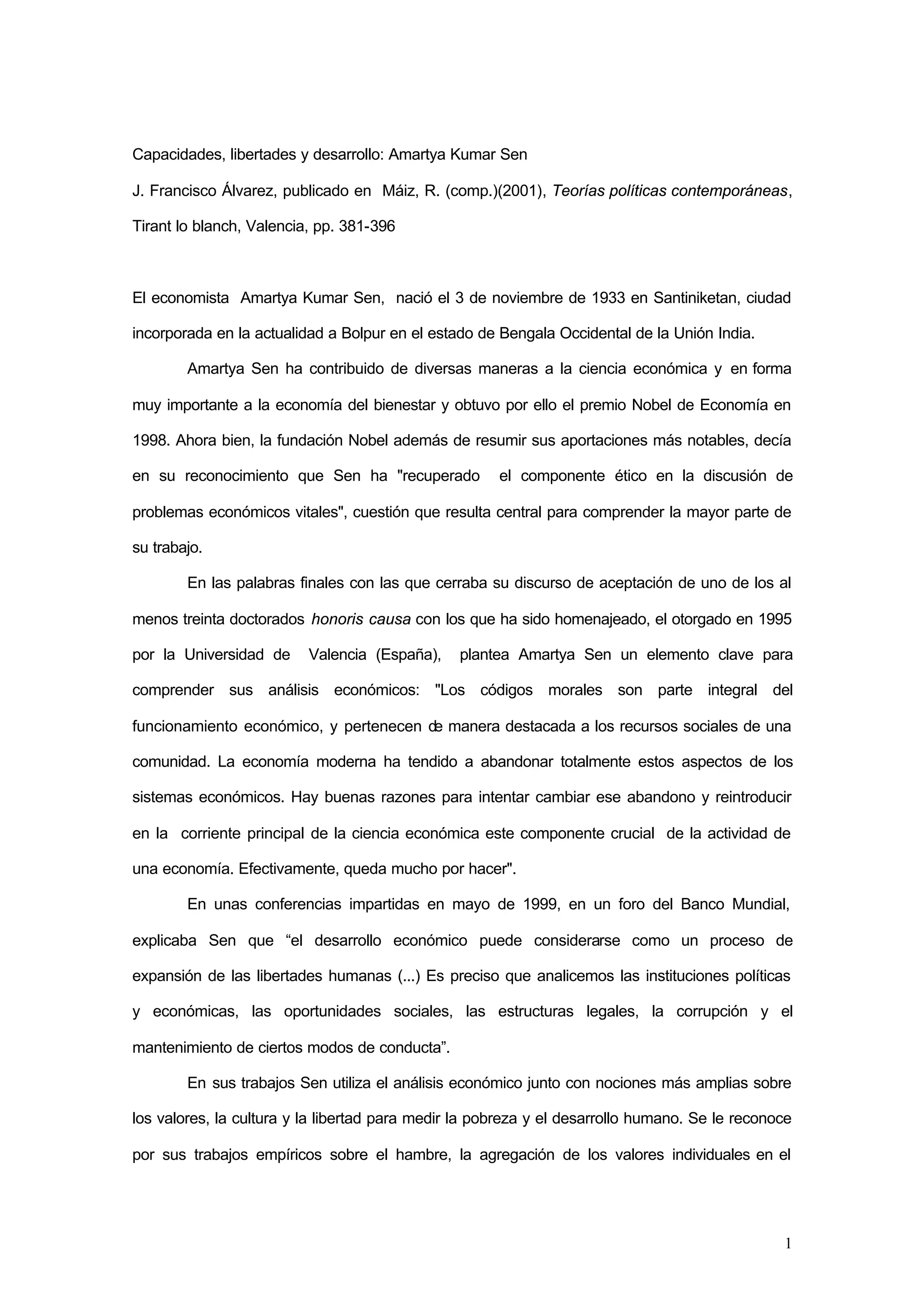 Amartya Sen es un economista indio galardonado con el Premio Nobel por su trabajo sobre la teoría de la elección social y la medición de la pobreza y el desarrollo humano. Propone entender el desarrollo como la expansión de las libertades reales de las personas, tanto los fines como los medios para el desarrollo. Ha criticado los enfoques estrictamente utilitaristas y ha argumentado que los códigos morales forman parte integral del funcionamiento económico. Su trabajo se ha centrado en mejorar las vidas de los miembros más pobres de