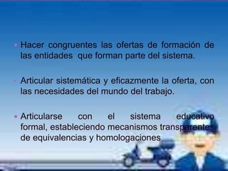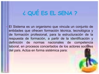 El SENA lidera un sistema nacional de formación para el trabajo basado en competencias laborales. Este sistema involucra a gremios, gobierno, sector productivo y educación para establecer habilidades requeridas por ocupaciones y validarlas. El SENA también se encarga de certificar y formar trabajadores en estas habilidades siguiendo recomendaciones de la OIT.