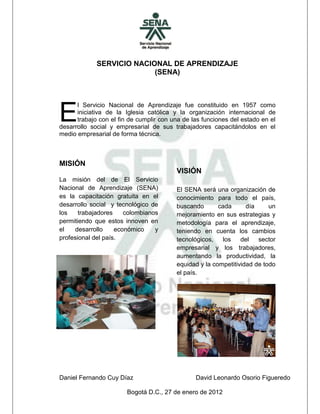 El documento presenta información sobre el Servicio Nacional de Aprendizaje (SENA) de Colombia. Fue creado en 1957 por la Iglesia Católica y la Organización Internacional del Trabajo con el objetivo de capacitar técnicamente a los trabajadores colombianos. Su misión es ofrecer capacitación gratuita para contribuir al desarrollo social, tecnológico y económico del país. Su visión es convertirse en una organización de conocimiento que mejore constantemente sus estrategias de aprendizaje considerando los