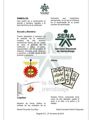 El Servicio Nacional de Aprendizaje (SENA) fue creado en 1957 por la Iglesia Católica y la Organización Internacional del Trabajo con el objetivo de capacitar técnicamente a los trabajadores colombianos. Su misión es ofrecer capacitación gratuita para contribuir al desarrollo social y económico del país. Su visión es convertirse en una organización de conocimiento que mejore continuamente sus estrategias de aprendizaje considerando los cambios tecnológicos y del sector empresarial para aumentar la productiv