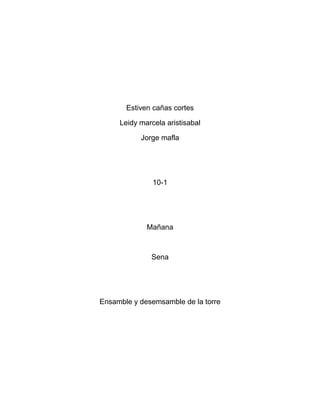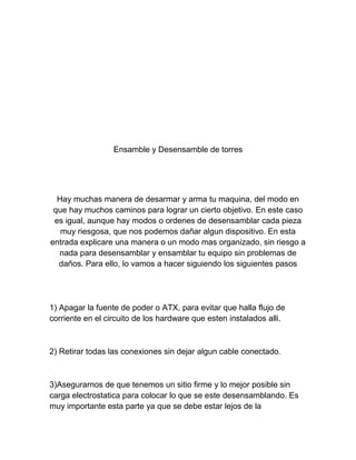 Este documento proporciona instrucciones en 15 pasos para desarmar y armar una torre de computadora de manera segura y organizada. Explica cómo retirar y volver a instalar cada componente importante como la fuente de poder, tarjeta madre, ventiladores, unidades de almacenamiento y más, para evitar daños por electrostática. También advierte sobre la importancia de seguir los pasos correctamente y tener cuidado con los tornillos para cada parte.