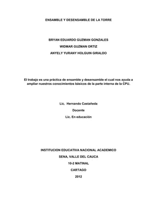 Este documento describe los pasos para ensamblar y desensamblar una torre de computadora. Explica los materiales necesarios como manillas antiestáticas y destornilladores. Luego detalla cada etapa del proceso, incluyendo la extracción y colocación de la tapa, cables, unidades internas y externas, tarjeta madre, memoria RAM, ventilador y microprocesador. El objetivo es ampliar los conocimientos básicos sobre el hardware interno de una CPU a través de la práctica de ensamblado y desensamblado.