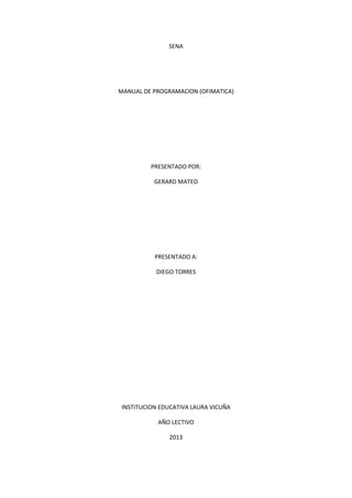 Este documento presenta un manual de programación en ofimática que incluye las etiquetas, sentencias y símbolos básicos utilizados en programación, como <?php ?> para indicar el inicio y fin de un código, echo para imprimir texto, ; para finalizar una línea, // y /* */ para agregar comentarios, $ para crear variables, y define para guardar valores. El documento fue presentado por Gerard Mateo a Diego Torres de la Institución Educativa Laura Vicuña en el año 2013.