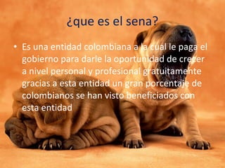 El SENA es una entidad colombiana creada en 1957 para ofrecer formación profesional gratuita a los trabajadores colombianos y así contribuir al desarrollo social, económico y tecnológico del país. Su visión es ser una organización de conocimiento innovadora que se adapte a los cambios tecnológicos y las necesidades del sector empresarial y laboral. Su misión es invertir en el desarrollo de los trabajadores colombianos ofreciendo formación profesional integral gratuita.