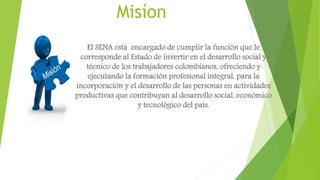 Este documento presenta información clave sobre el Sena, incluyendo su misión y visión, los símbolos de su escudo y bandera, los roles del aprendiz y el instructor, los servicios de bienestar para aprendices, y las plataformas Blackboard y Sofía Plus utilizadas para la administración y aprendizaje.