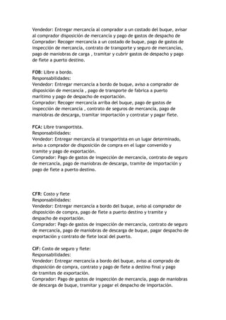 El documento describe diferentes normas y términos relacionados con el comercio internacional. Explica brevemente el código de comercio, las normas ISO 9000 para sistemas de calidad, las normas ICONTEC para presentación de documentos y las normas INCOTERMS que establecen las responsabilidades de compradores y vendedores en transacciones internacionales. Define varios términos INCOTERMS como EXW, FOB, CIF, CPT, DDP y sus respectivas obligaciones.