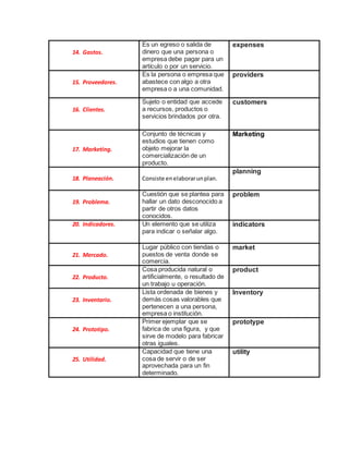Este documento proporciona definiciones en español e inglés de términos clave relacionados con el marketing y la administración de negocios. Algunos de los términos definidos incluyen segmento de mercado, propuesta de valor, características, beneficios, canales de comunicación, distribución y ventas, ingresos, recursos físicos y humanos, actividades, aliados estratégicos, costos, gastos, proveedores, clientes, marketing, planeación, problema, indicadores, mercado, producto, inventario