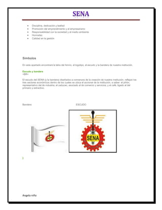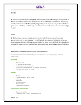 El documento presenta la misión, visión, principios y valores del Servicio Nacional de Aprendizaje (SENA) de Colombia. Su misión es ofrecer formación profesional gratuita para incorporar a los trabajadores en actividades productivas que contribuyan al desarrollo del país. Su visión es ser una organización innovadora de conocimiento para todos los colombianos. Los principios incluyen la vida, dignidad humana y bien común, mientras que los valores son el respeto, solidaridad y justicia. También presenta su logotipo, escudo, bandera