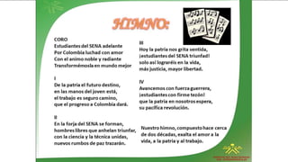 El documento describe la misión, visión, símbolos y plataformas tecnológicas del Servicio Nacional de Aprendizaje (SENA) de Colombia. La misión del SENA es ofrecer formación profesional integral para facilitar la incorporación laboral. Su visión para 2020 incluye ser una entidad líder en formación e innovación para aumentar la competitividad de Colombia. El SENA utiliza las plataformas Sofía Plus, Blackboard y SENA Móvil para gestionar la formación de manera eficiente y flexible.