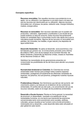 El documento presenta conceptos clave sobre recursos renovables, no renovables y desarrollo sostenible. También resume la normatividad ambiental colombiana relacionada con estos temas, incluyendo leyes y decretos sobre recursos naturales, licencias ambientales, participación comunitaria y patrimonio cultural y natural.