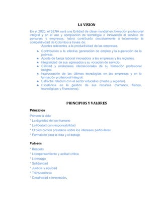 El Servicio Nacional de Aprendizaje (SENA) se creó en Colombia en 1957 para brindar formación técnica y complementaria a adultos. Tuvo un enfoque tripartito que involucraba a trabajadores, empleadores y el gobierno. Con el paso de los años, el SENA busca suplir las necesidades de mano de obra calificada de las empresas y lograr un cambio en la productividad a través de métodos modernos de formación.