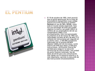 El Pentium fue el quinto procesador de Intel lanzado en 1992. Tenía 3.1 millones de transistores, caché de 8 KB para datos e instrucciones, y podía ejecutar dos instrucciones simultáneamente. Las primeras computadoras se programaban en lenguaje de máquina y usaban componentes de válvulas. Los dispositivos de almacenamiento ópticos como CDs y DVDs usan láser para leer y escribir agujeros microscópicos que almacenan datos digitalmente.