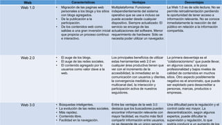 Este documento compara las características de las webs 1.0, 2.0 y 3.0. La web 1.0 permitía solo lectura de contenidos, mientras que la 2.0 introdujo blogs y redes sociales que permiten agregar contenido de usuarios. La web 3.0 trae búsquedas inteligentes, evolución de redes sociales, mayor rapidez y facilidad de navegación. Cada versión tiene ventajas como accesibilidad multiplataforma y actualizaciones automáticas, pero también desventajas como falta de retroal