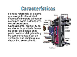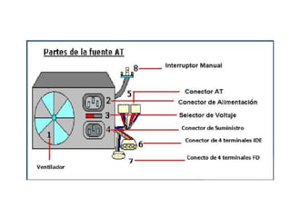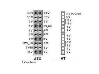 El documento describe las diferencias entre las fuentes de poder AT y ATX. La fuente AT se caracteriza por ser análoga para encender y apagar, tener conectores variables a la placa madre y estar siempre activada a través de un interruptor de 220V. La fuente ATX se caracteriza por ser digital para encender y apagar, tener un solo conector estandar a la placa madre, y estar siempre alimentada con una pequeña tensión para mantenerse en espera. La fuente AT es más rudimentaria electrónicamente que la ATX.