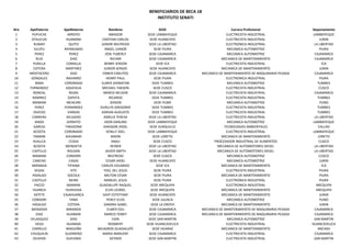 Este documento presenta una lista de 118 estudiantes de diferentes carreras profesionales y sedes del Senati. Se incluye el número de registro, apellidos, nombres, sede de estudios, carrera y departamento de cada estudiante. La lista proporciona información básica sobre los estudiantes del Senati en Perú.