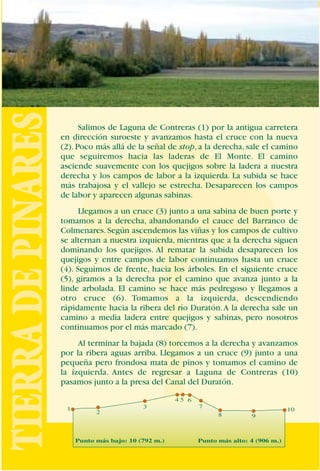 Este documento describe una ruta de senderismo de 2 horas y 45 minutos que recorre 7.9 km desde Laguna de Contreras hasta regresar al mismo punto. La ruta asciende por laderas cubiertas de quejigos, pasa junto a campos de cultivo y viñedos, y desciende hasta el río Duratón antes de regresar a Laguna de Contreras. El documento proporciona detalles sobre la vegetación, características del terreno y cruces a lo largo de la ruta.