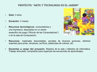 Este documento describe un proyecto de arte y tecnología en el jardín de infantes para niños de 5 años. El proyecto durará 3 meses e involucrará la creación de retratos y pinturas utilizando computadoras e impresoras. Los niños explorarán los estilos y técnicas de artistas como Antonio Berni, Joan Miró y Jackson Pollock. Al finalizar, compilarán sus obras en un CD para compartir con sus familias.