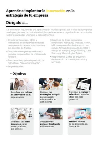 El programa Senior Management in Digital Innovation de ICEMD está diseñado para directivos que buscan integrar la innovación en sus estrategias empresariales y culturales. Este curso intensivo de 48 horas abarca temas como la creación de una cultura de innovación, gestión del talento, modelos de negocio disruptivos y metodologías ágiles. A través de talleres prácticos y el intercambio con expertos del sector, los participantes aprenderán a implementar la innovación de manera efectiva en sus organizaciones.
