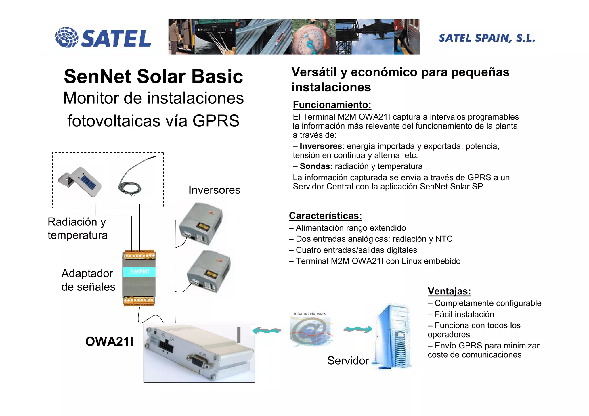 El SenNet Solar Basic es un monitor de instalaciones fotovoltaicas que captura datos como la energía importada y exportada desde inversores y datos de radiación y temperatura desde sondas. Estos datos se envían a través de GPRS a un servidor central para su análisis. Es versátil, económico y fácil de instalar para pequeñas instalaciones solares, funcionando con diferentes operadores GPRS.