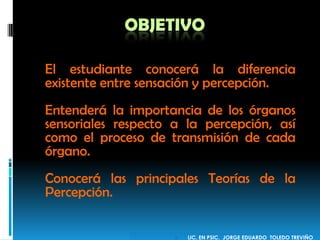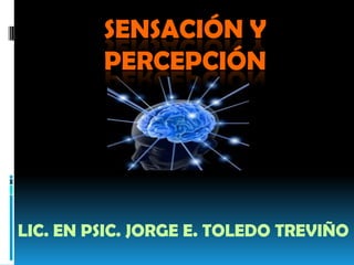 Este documento resume la diferencia entre sensación y percepción. Explica que la sensación se origina en los órganos sensoriales y se transmite al cerebro en forma de estímulos nerviosos, mientras que la percepción es el proceso de organizar e interpretar la información sensorial para formar representaciones del mundo exterior. También describe los principales órganos sensoriales y teorías de la percepción como la psicología de la Gestalt.