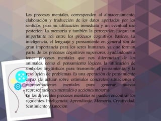 El documento describe varios procesos mentales como la percepción, memoria, pensamiento, lenguaje y aprendizaje. Explica que la percepción nos permite captar información del entorno y darle significado, mientras que la memoria nos permite almacenar y recuperar información del pasado. También describe los sistemas nerviosos simpático y parasimpático, que controlan funciones involuntarias del cuerpo.