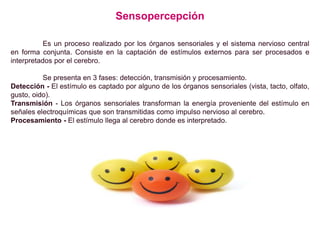 Este documento trata sobre la sensopercepción y los trastornos asociados. Explica que la sensopercepción involucra la detección de estímulos, su transmisión a través de los órganos sensoriales y su procesamiento en el cerebro. Luego describe distintos tipos de distorsiones y errores sensoriales como ilusiones, alucinaciones y pseudohalucinaciones, así como síntomas como la agitación, las alucinaciones y la angustia que son de valor diagnóstico para diferentes trastornos.