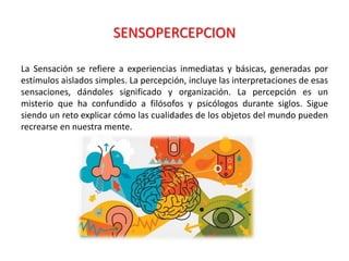 Este documento trata sobre la sensopercepción y los trastornos asociados. Explica que la sensación se refiere a experiencias básicas generadas por estímulos simples, mientras que la percepción incluye la interpretación y significado de esas sensaciones. Luego describe dos tipos de trastornos de la sensopercepción: distorsiones sensoriales como cambios en la forma, cualidad o intensidad perceptiva; y errores sensoriales como ilusiones, alucinaciones y síndromes de automatismo mental. Finalmente, analiza vari