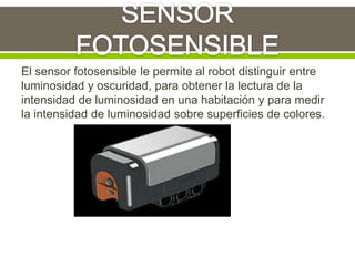 El sensor fotosensible le permite al robot distinguir entre luminosidad y oscuridad, para obtener la lectura de la intensidad de luminosidad en una habitación y para medir la intensidad de luminosidad sobre superficies de colores.