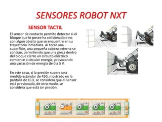 El documento describe el sensor táctil del robot LEGO MINDSTORMS NXT. El sensor táctil permite detectar si un bloque ha colisionado con un objeto al tocar una superficie y cerrar un circuito eléctrico. Cuando la presión sobre el sensor excede los 450 grados estándar, se considera que el sensor está presionado.