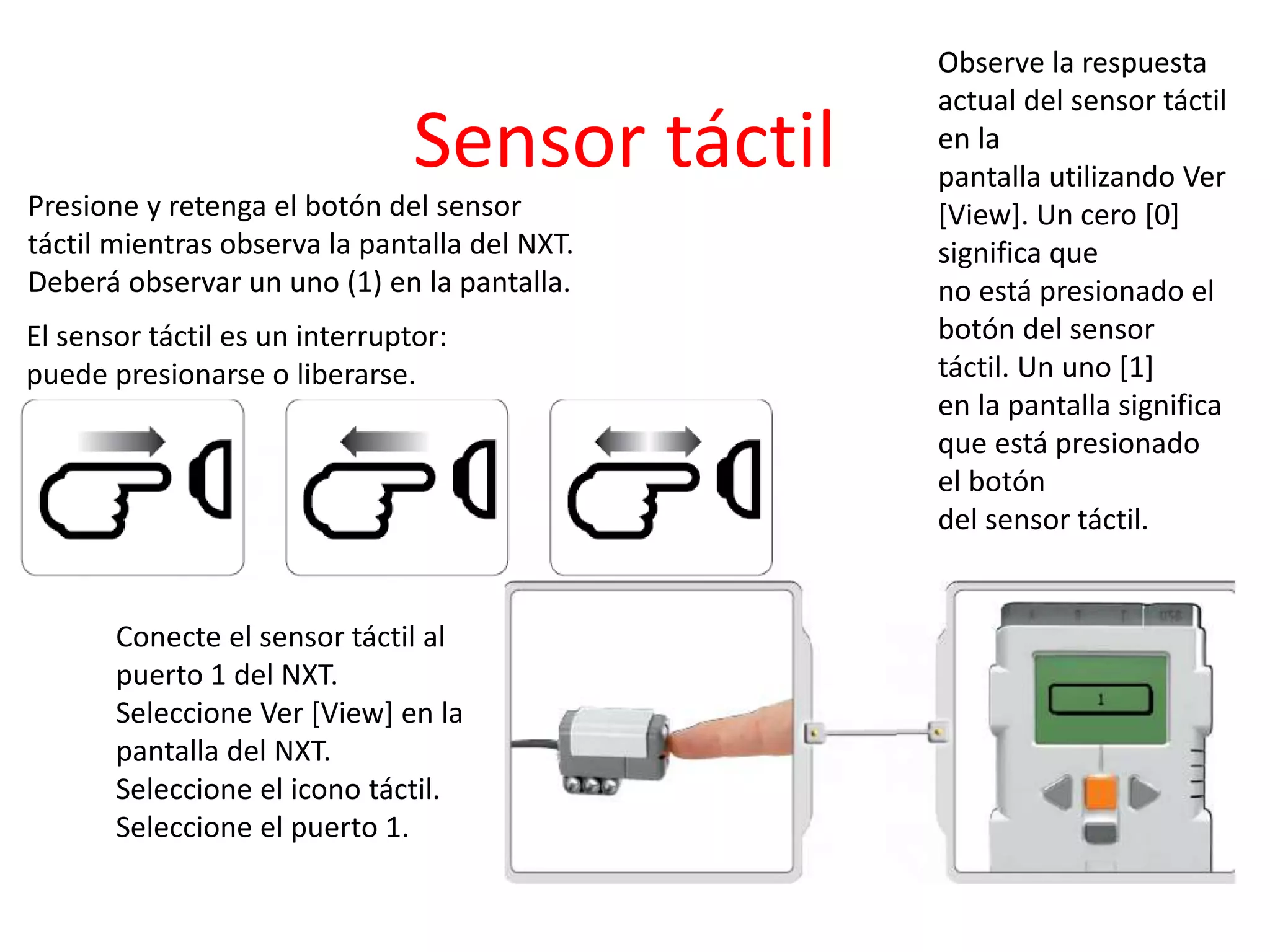Este documento describe varios sensores y componentes del LEGO MINDSTORMS NXT, incluyendo el sensor táctil, el sensor acústico, el sensor fotosensible, el sensor ultrasónico, el servomotor interactivo, las lámparas y la tecnología Bluetooth. Explica cómo conectar y probar cada sensor y componente y qué tipo de información pueden medir o controlar.