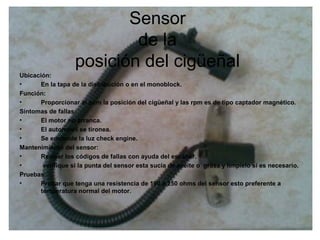 Este documento describe varios sensores importantes en un automóvil, incluyendo sensores de temperatura del motor, posición del cigüeñal, detonación, gases de escape, inyección, estacionamiento y frenos. Cada sensor juega un papel clave en el monitoreo y control del rendimiento y emisiones del vehículo.