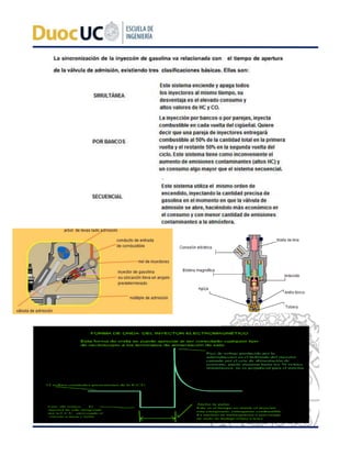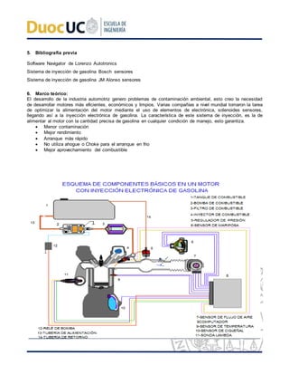 Este documento describe los componentes principales de un sistema de inyección electrónica, incluyendo sensores, bomba de combustible, filtro, regulador de presión e inyectores. Explica cómo cada sensor mide una condición del motor y transmite una señal eléctrica a la unidad de control del motor. El objetivo es que los estudiantes aprendan a reconocer estos componentes y verificar su funcionamiento a través de simulaciones prácticas.