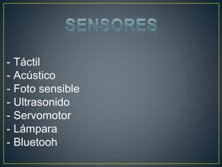El documento describe varios sensores y componentes que pueden usarse con el robot LEGO MINDSTORMS NXT, incluyendo sensores táctiles, acústicos, fotosensibles, ultrasónicos, servomotores, lámparas y Bluetooth. Proporciona sugerencias sobre cómo usar cada sensor y componente y cómo ver sus lecturas en la pantalla del NXT.