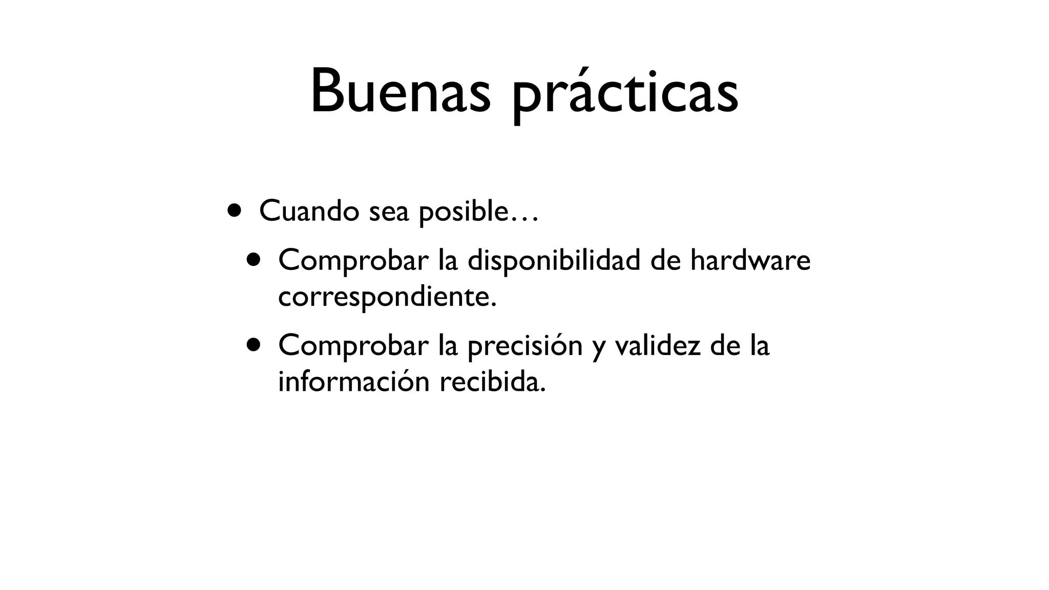 El documento detalla el funcionamiento y aplicaciones de diversos sensores como acelerómetros, giroscopios, magnetómetros, sensores de proximidad y luz ambiental. Cada sensor se describe con su unidad de medida, usos y forma de lectura de datos. Además, se mencionan buenas prácticas para asegurar la disponibilidad y precisión del hardware.