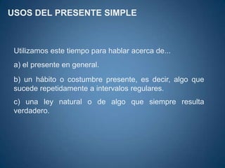 El documento describe las estructuras y usos del presente simple en inglés, incluyendo la construcción de oraciones afirmativas, negativas e interrogativas. Explica que los auxiliares se colocan delante del verbo principal en oraciones negativas e interrogativas, y que los complementos como lugar y tiempo suelen ir al final de la oración, con lugar antes que tiempo. Además, los adverbios normalmente van delante del verbo en formas simples y entre auxiliar y verbo principal en formas compuestas.