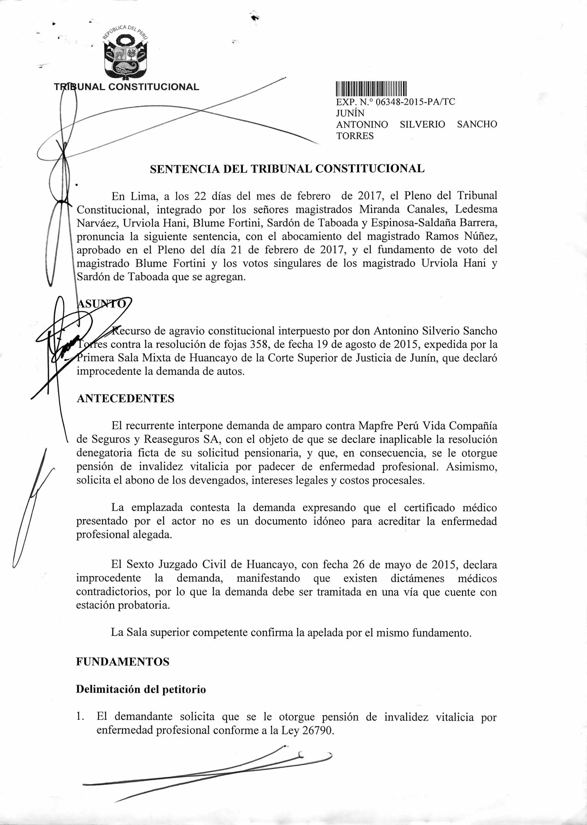 El Tribunal Constitucional falla a favor del demandante Antonino Silverio Sancho Torres y ordena a la entidad demandada otorgarle una pensión de invalidez vitalicia por enfermedad profesional. El Tribunal determina que el demandante padece de neumoconiosis en primer estadio y enfermedad pulmonar intersticial difusa, lo que le genera al menos el 50% de incapacidad laboral. Por lo tanto, se ordena el pago de la pensión desde enero de 2014, así como los intereses legales y costos del proceso.