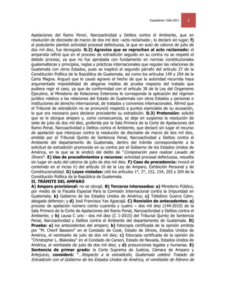 El expediente 1566-2011 aborda la apelación de Alfonso Antonio Portillo Cabrera contra una sentencia de la Corte Suprema de Justicia respecto a su extradición a EE.UU. por lavado de dinero. El tribunal concluyó que no hubo violaciones al debido proceso y denegó el amparo, afirmando que la extradición fue válida bajo el tratado existente entre Guatemala y EE.UU. y que el delito de lavado de dinero es considerado permanente en este contexto jurídico.
