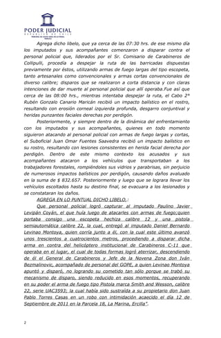 Este documento resume un juicio en contra de Daniel Bernardo Levinao Montoya por el delito de homicidio frustrado a un general de Carabineros. Se presenta evidencia como testimonios de oficiales de Carabineros que indican que Levinao Montoya recibió un arma de otro individuo mientras huía de la policía y disparó contra un helicóptero de Carabineros, apuntando luego al general pero sin lograr disparar debido a un problema con el arma. Levinao Montoya niega los cargos. El juicio busca determinar su