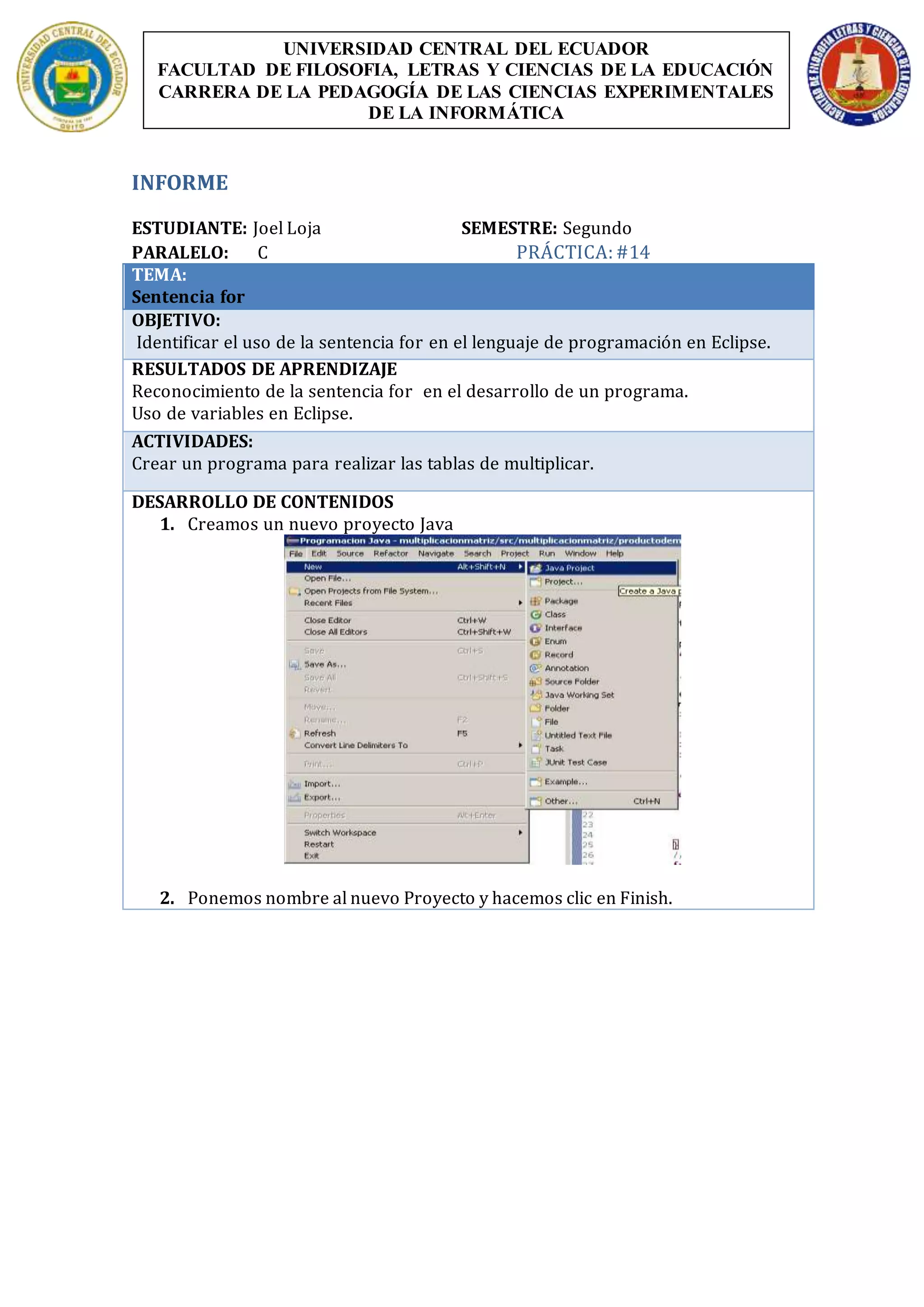El documento presenta un informe de práctica realizada por el estudiante Joel Loja en su segundo semestre de la carrera de Pedagogía de las Ciencias Experimentales de la Informática. El objetivo de la práctica fue identificar el uso de la sentencia for en el desarrollo de programas en Eclipse. Como parte de las actividades, Loja creó un programa para generar tablas de multiplicar utilizando variables y la sentencia for.