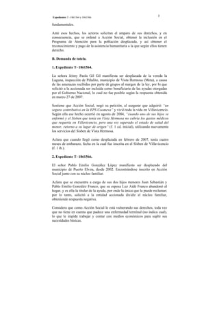 Este documento presenta dos casos de tutela (T-1861564 y T-1861566) instaurados por personas desplazadas (Jeimy Paola Gil Gil y Pablo Emilio González López) contra la Agencia Presidencial para la Acción Social y la Cooperación Internacional (Acción Social), debido a que esta negó su inscripción en el Registro Único de Población Desplazada. El Juzgado Segundo Penal del Circuito de Villavicencio no tuteló los derechos de los actores. Los casos fueron remitidos a la Corte