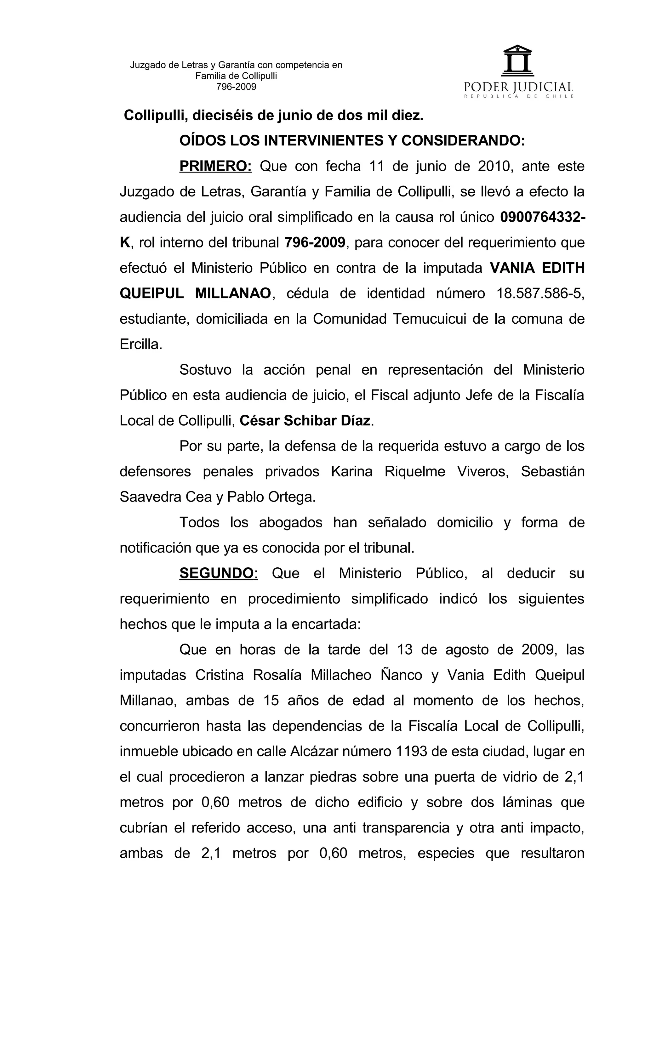 Este documento resume los detalles de una audiencia judicial realizada el 16 de junio de 2010 en el Juzgado de Letras y Garantía con competencia en Familia de Collipulli para juzgar a Vania Edith Queipul Millanao por el delito de daños simples. El Ministerio Público alega que la acusada lanzó piedras contra la puerta de vidrio de la fiscalía local de Collipulli el 13 de agosto de 2009, causando $73.580 en daños. Varios testigos declararon, incluido el director y profesor de