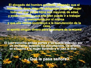1) Una pareja se presenta ante un juez para el trámite de divorcio, donde la mujer reclama una pensión y parte de la casa, mientras que el hombre alega que no tiene obligaciones hacia ella.