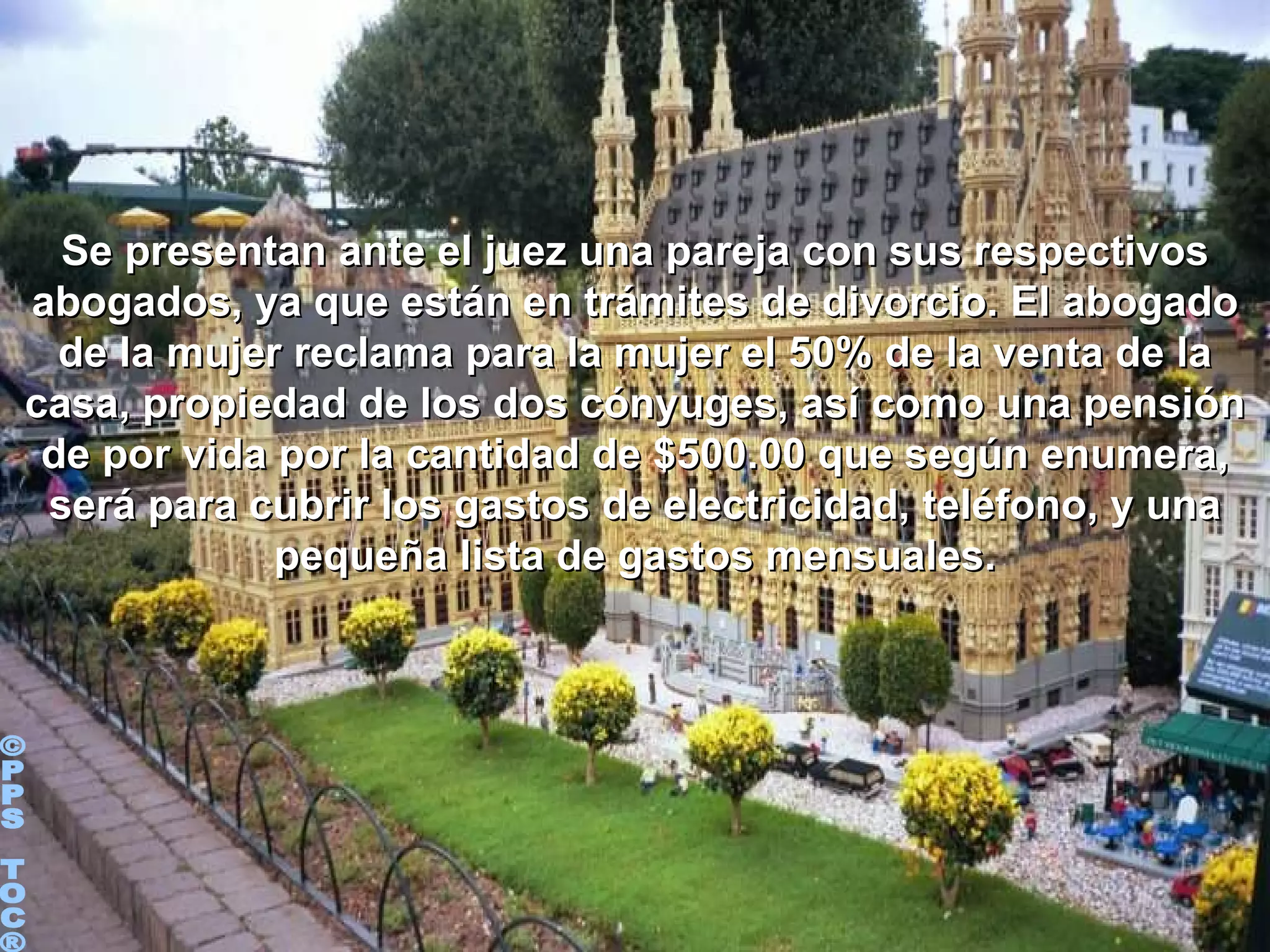 Una pareja se presenta ante el juez para el trámite de divorcio. El abogado de la mujer reclama una pensión de por vida para ella, mientras que el abogado del hombre alega que ella puede mantenerse por sí misma. La mujer explica al juez que pospuso su educación y carrera profesional para ocuparse de la casa, los hijos y la suegra a petición de su esposo. El juez falla a favor de la mujer, adjudicándole la casa, el auto y las cuentas bancarias debido a los 26 años de servicios