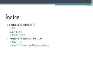Este documento describe las estructuras de control de selección en Java, incluyendo las sentencias IF, IF-ELSE, IF-ELSEIF y SWITCH. La sentencia IF ejecuta instrucciones condicionalmente dependiendo de si se cumple una condición. La sentencia IF-ELSE ejecuta uno de dos bloques de instrucciones dependiendo de la condición. La sentencia IF-ELSEIF permite evaluar múltiples condiciones. La sentencia SWITCH elige un bloque de instrucciones dependiendo del valor de una variable.