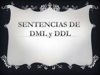 El documento describe los lenguajes DML y DDL de SQL. DML (Data Manipulation Language) se utiliza para consultar, insertar, actualizar y eliminar datos en una base de datos. DDL (Data Definition Language) se utiliza para definir y modificar la estructura subyacente de una base de datos, incluidas las tablas, índices y procedimientos almacenados. El documento proporciona ejemplos de comandos DDL como CREATE, DROP y ALTER.