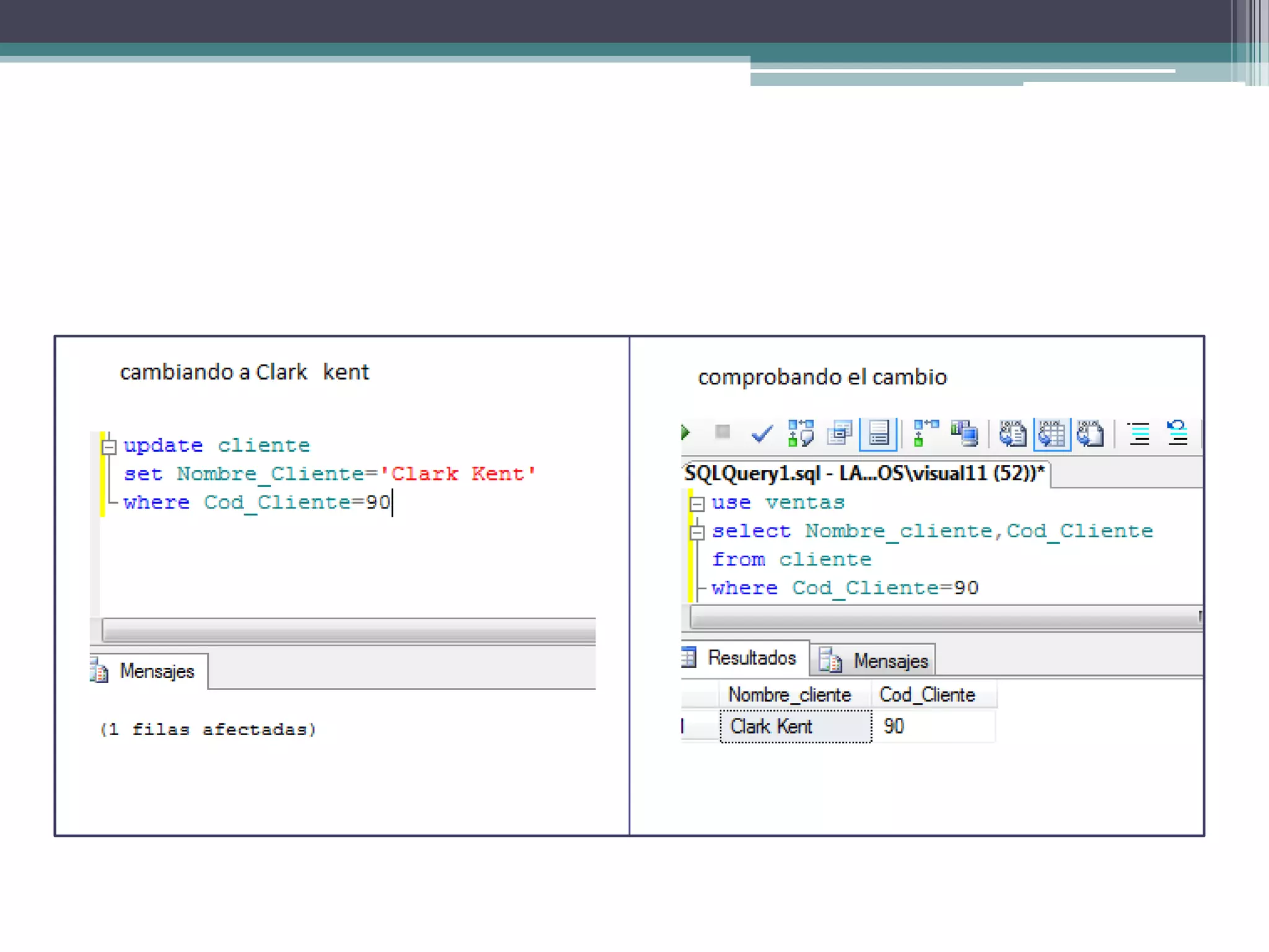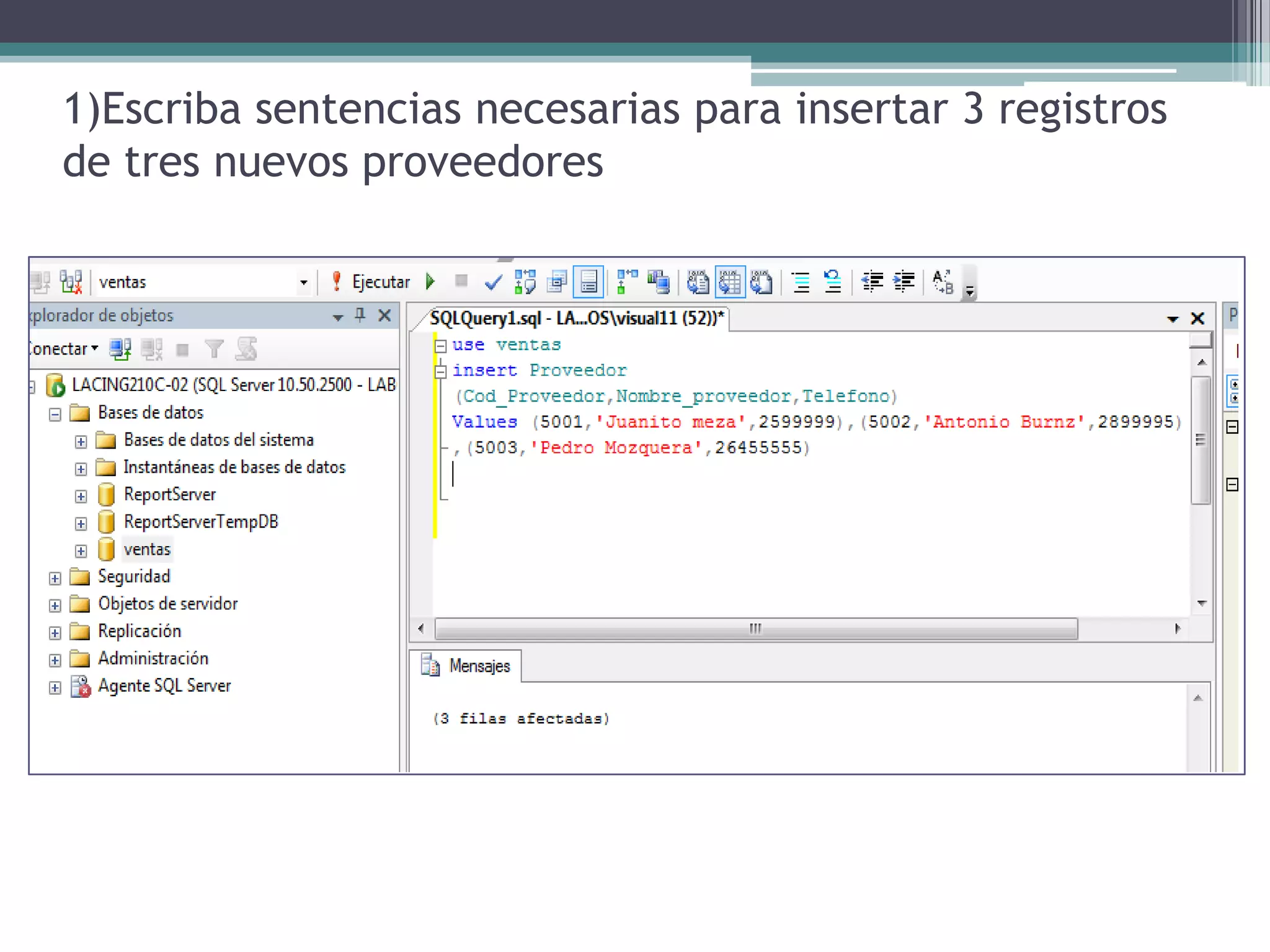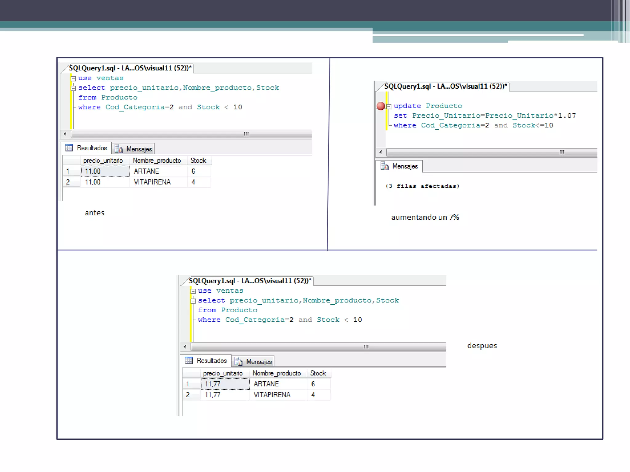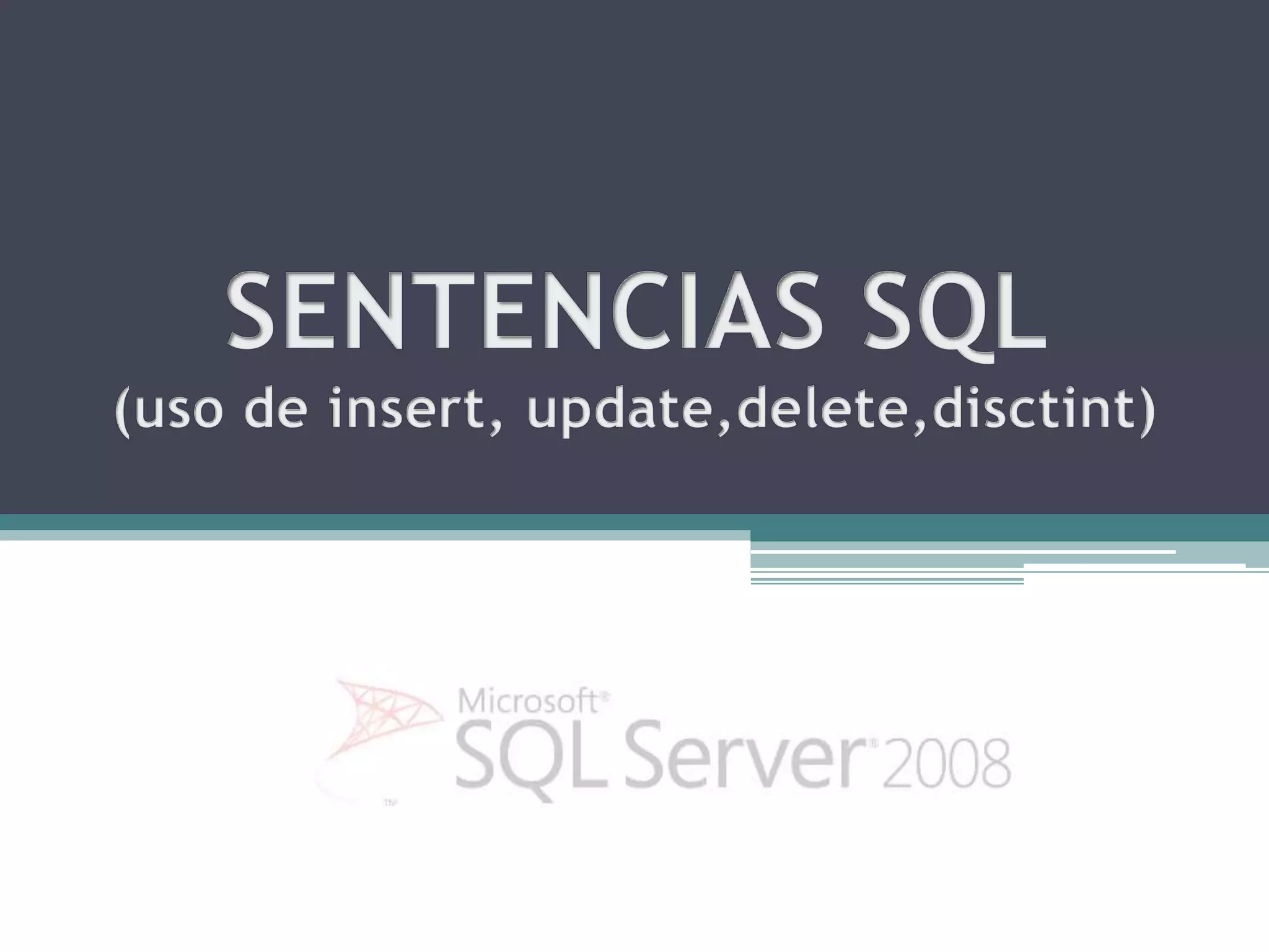 Este documento explica cómo usar sentencias SQL como INSERT, UPDATE, DELETE y DISTINCT para manipular datos en una base de datos. Explica cómo insertar nuevos registros, actualizar precios de productos en función de categorías y stock, cambiar el nombre de un cliente específico, e incluir cálculos en consultas SELECT sin modificar los registros reales.