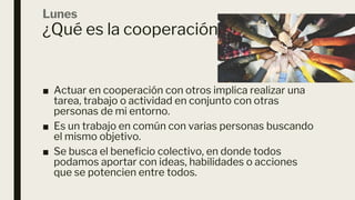 La cooperación implica trabajar junto con otros para lograr un objetivo común. Requiere colaboración, comunicación y esfuerzo compartido. Practicar la cooperación mejora los resultados y permite alcanzar metas que serían difíciles de obtener individualmente.