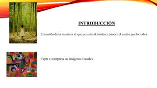 Este documento presenta la información sobre el sentido de la visión. Explica que el lóbulo occipital procesa los estímulos visuales y cómo el globo ocular capta las imágenes. Describe las partes del ojo como la córnea, cristalino, retina y sus funciones. También cubre conceptos como acomodación, campo visual, y patologías oculares comunes como la miopía, hipermetropía y astigmatismo. El resumen concluye que la visión es fundamental para observar el entorno y desplazarse.